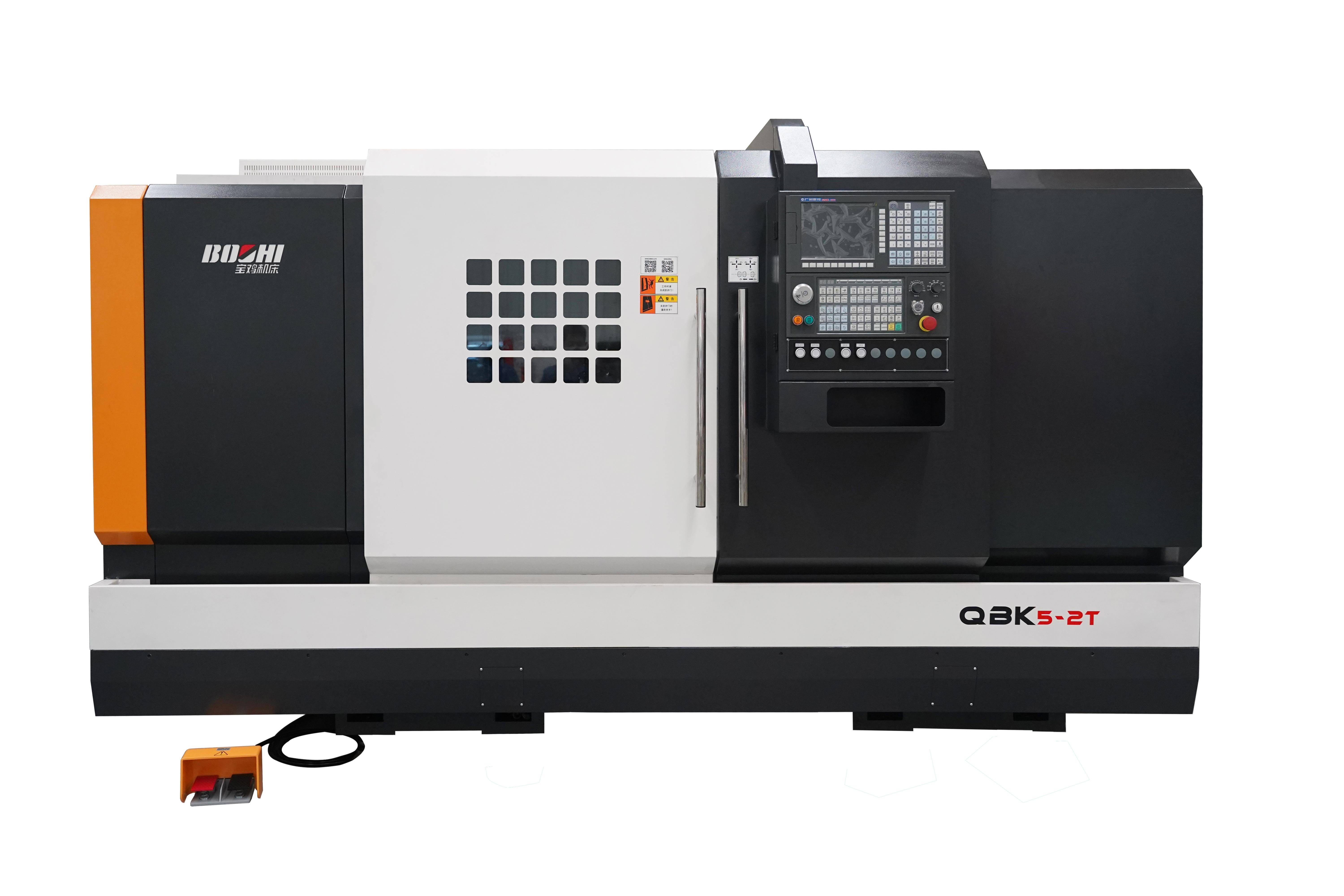 QBK5-2T數控車床是針對風電領域所用緊固螺栓加工而開發的一款中間驅動數控車床,該車床采用兩個單側液壓驅動筒夾夾持工件中部,左右兩側各配置一組排式刀架,通過兩側刀具同時車削,實現對工件的一次裝夾,完成兩端外圓、端面的高效加工。為適用不同長度工件加工需求,兩側夾頭間距可通過程序控制實現自動調整,方便快捷。